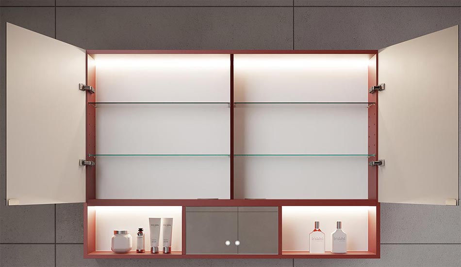 Шкафът за баня Smart с 3 врати е осветен. Светлината вътре улеснява намирането на необходимия артикул. Можете да включите осветлението със сензорен ключ. Мебелите могат да имат и светещи вдлъбнатини и декоративно сияние, което пада върху умивалника и горната част на шкафа.
