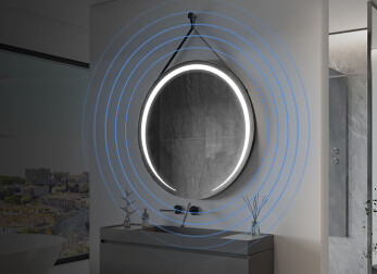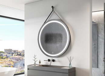 Кръглото осветено огледало е закрепено към кожения колан, който е достъпен в три цветови варианта по избор: черен, светлокафяв и тъмнокафяв. Опцията за персонализация позволява да приспособите огледалото към собствените предпочитания и стила на интериора. Стилен колан от истинска кожа.